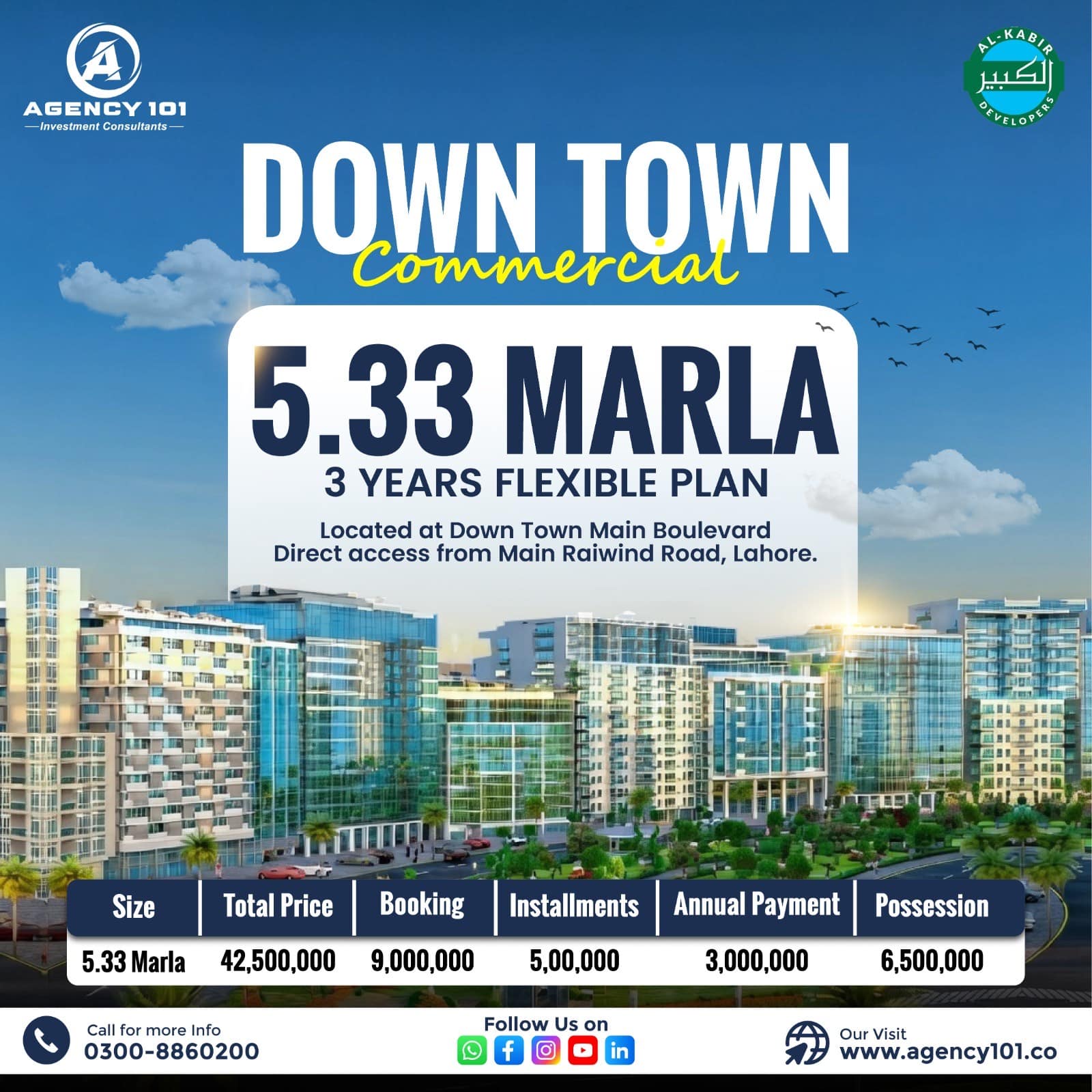 Al-Kabir Downtown stands as a landmark commercial hub, spanning 600 kanals of prime land with a 1,400-feet frontage on Main Raiwind Road. Featuring 10 Marla and 5.33 Marla commercial plots, including select plots facing the Main Boulevard, it offers unmatched business potential. Designed as a tax-free zone, Downtown presents a rare and exceptional opportunity for both local and international investors seeking growth, prestige, and long-term value.